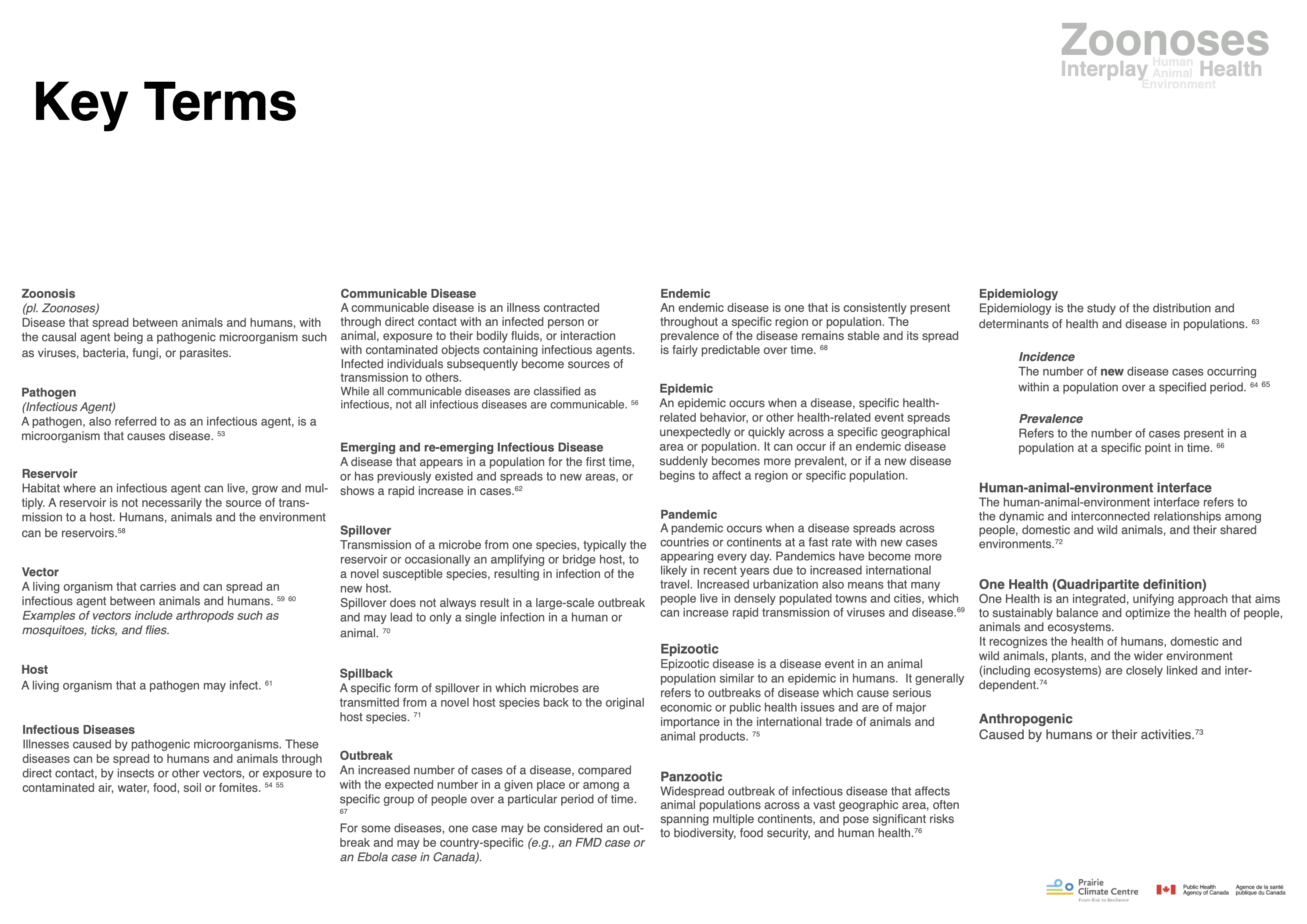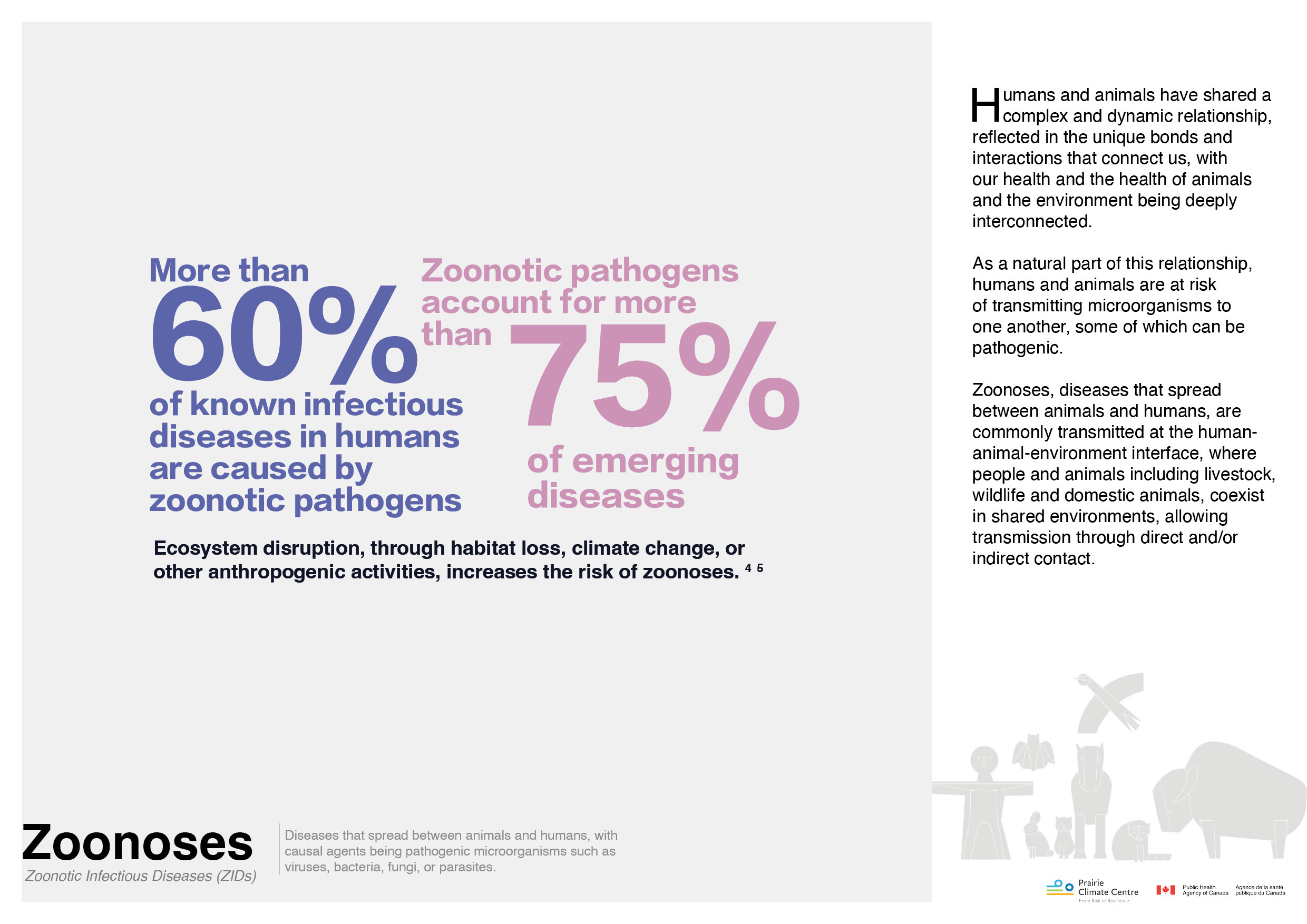 Modes of transmission, exposure risks, prevention measures, and the Canadian landscape of monitoring and surveillance of zoonoses.