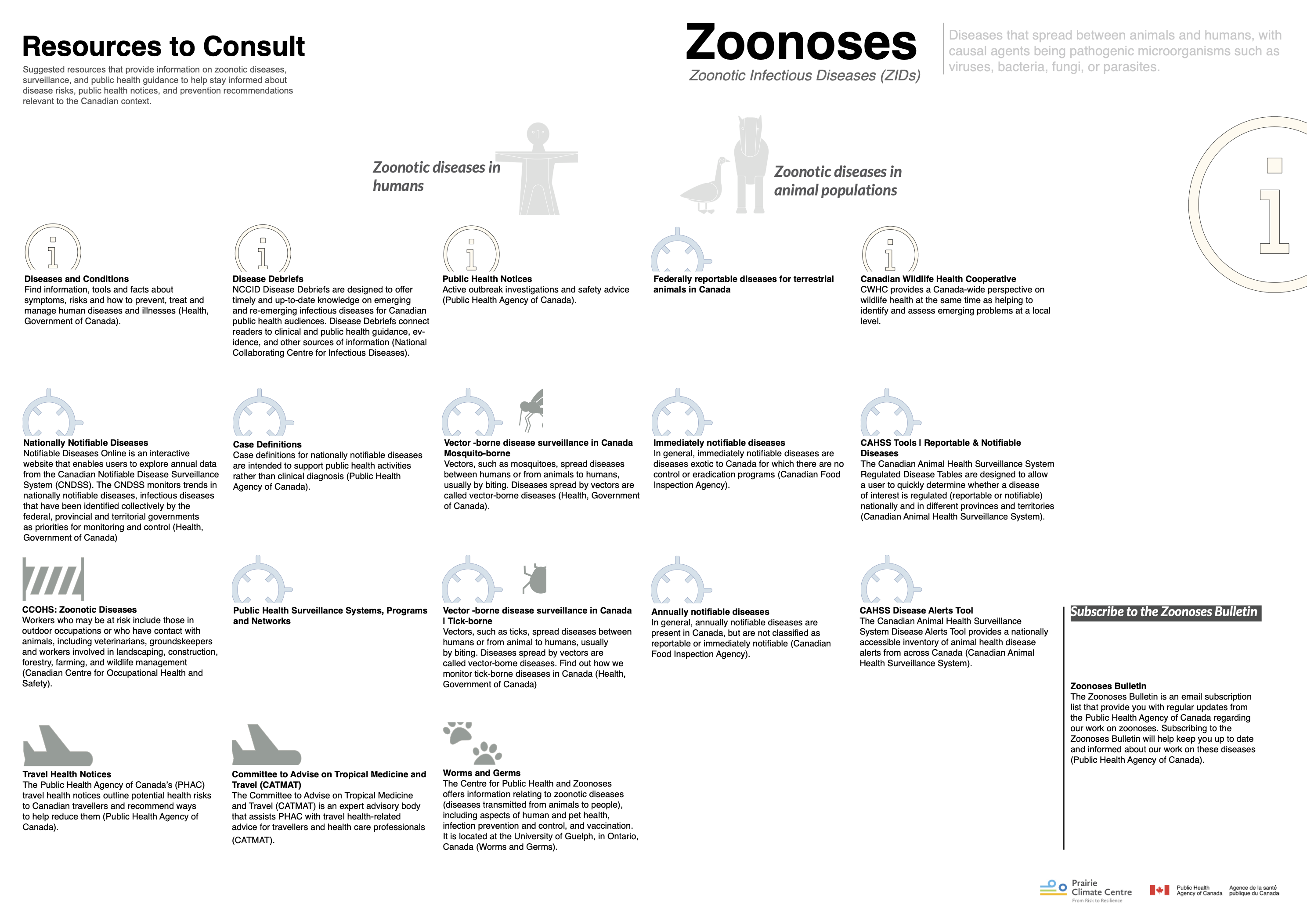 Suggested resources that provide information on zoonotic diseases, surveillance, and public health guidance to help stay informed about disease risks, public health notices, and prevention recommendations relevant to the Canadian context.